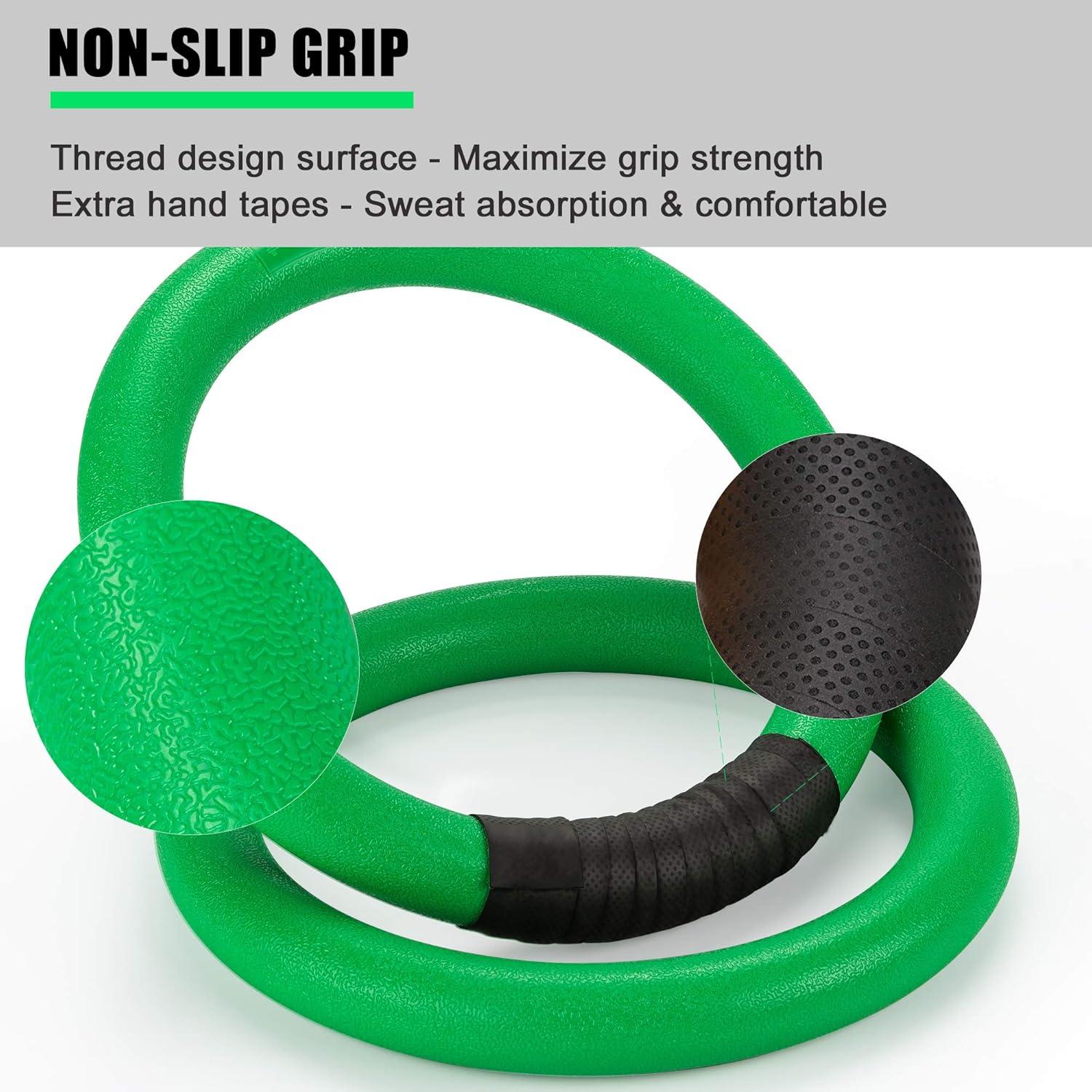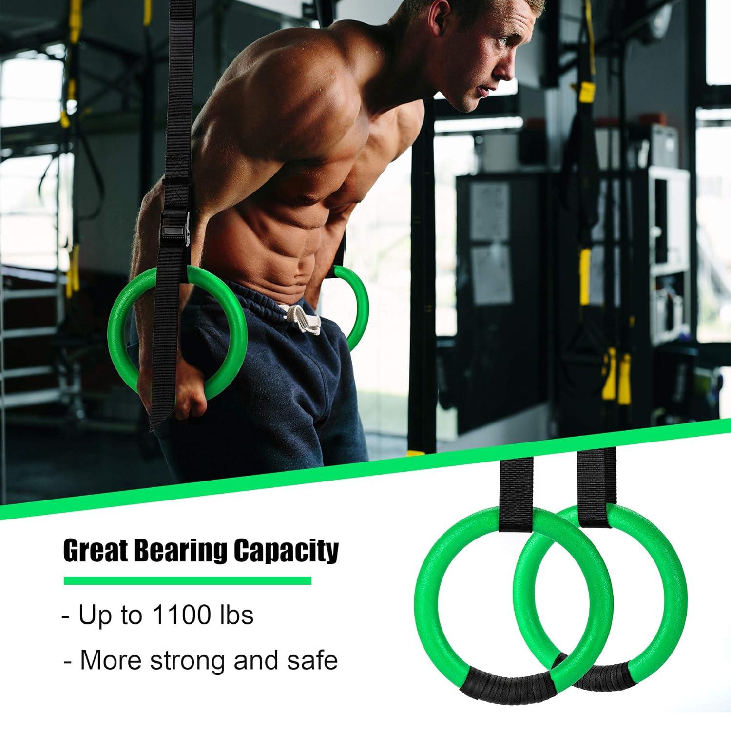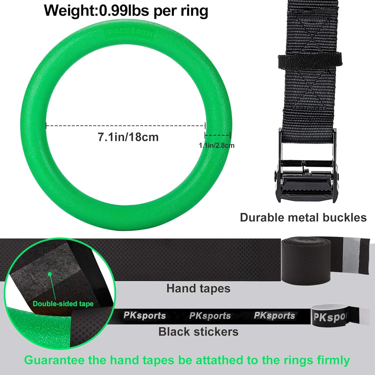 Gymnastic Rings: 1100 lbs Weight Capacity – PACEARTH exercise rings' weight capacity is up to 1100 lbs, much more than other 600 lbs ones. Made of higher quality material ABS and are thicker, these gymnastics rings are safer and more comfortable for you to hold onto. (Outer diameter: 7.1”; Thickness: 1.1”)